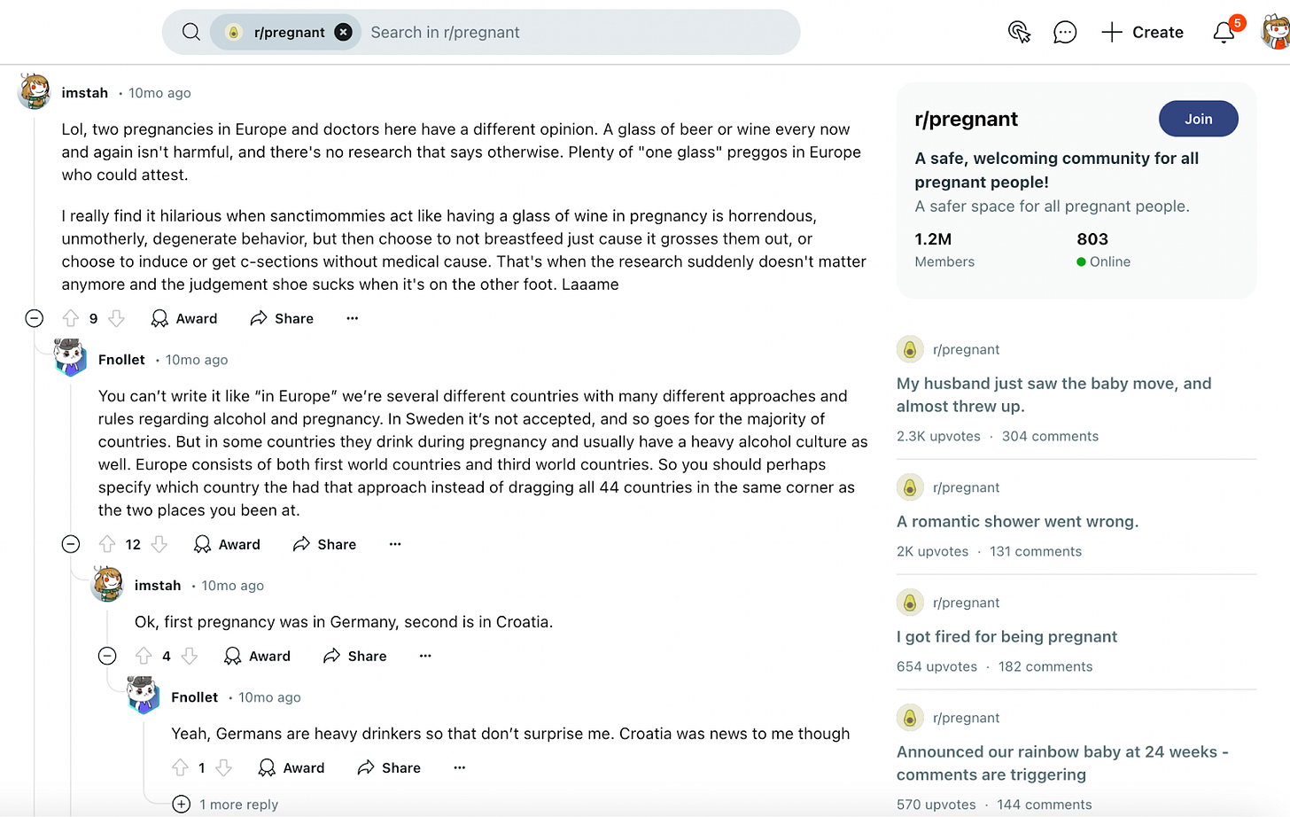 For example, here’s the advice u/oilydischarge18 gave to u/Olt1994 about the continued use of antidepressants in pregnancy: “You can absolutely stay on antidepressants. A depressed mother is much worse for a baby than some of the medications available.” Chimed in user u/RottenPotato1020: “Sweetheart, do not talk to your GP about this, they are not qualified like an OB. Your OB would definitely want you on the meds. Sertraline is very safe in pregnancy and breastfeeding. ❤️” Or, finally, says u/imstah about drinking wine while pregnant: “I really find it hilarious when sanctimommies act like having a glass of wine in pregnancy is horrendous, unmotherly, degenerate behavior, but then choose to not breastfeed just cause it grosses them out, or choose to induce or get c-sections without medical cause. That's when the research suddenly doesn't matter anymore and the judgement shoe sucks when it's on the other foot. Laaame [sic].”